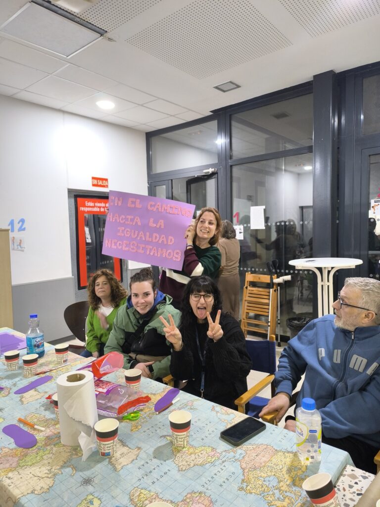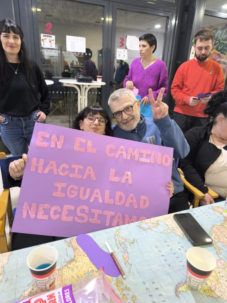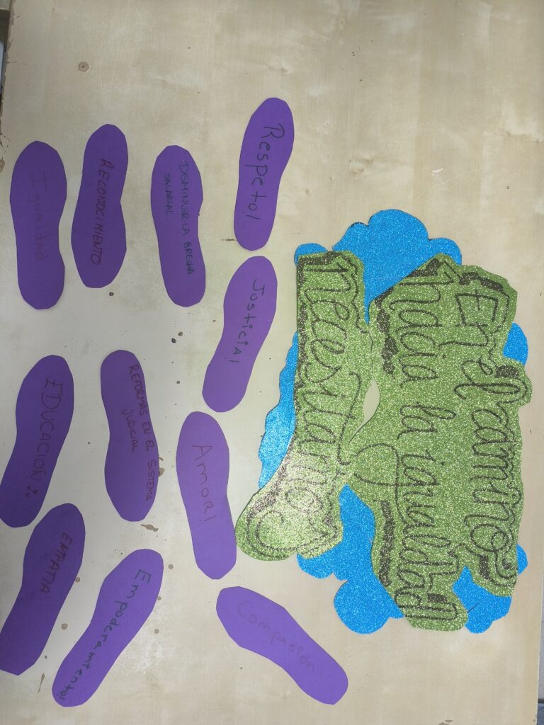 Así dentro del taller de manualidades se ha generado un rico debate en el que hemos hablado sobre que cosas queremos reivindicar en el camino a la igualdad. Ha sido un momento muy bonito en el que las y los participantes se han expresado con respeto y libertad. Todas estas ideas han quedado plasmadas en unas huellas que formarán ese camino a la igualdad y que decorarán los espacios de los proyectos. Y que os compartimos….